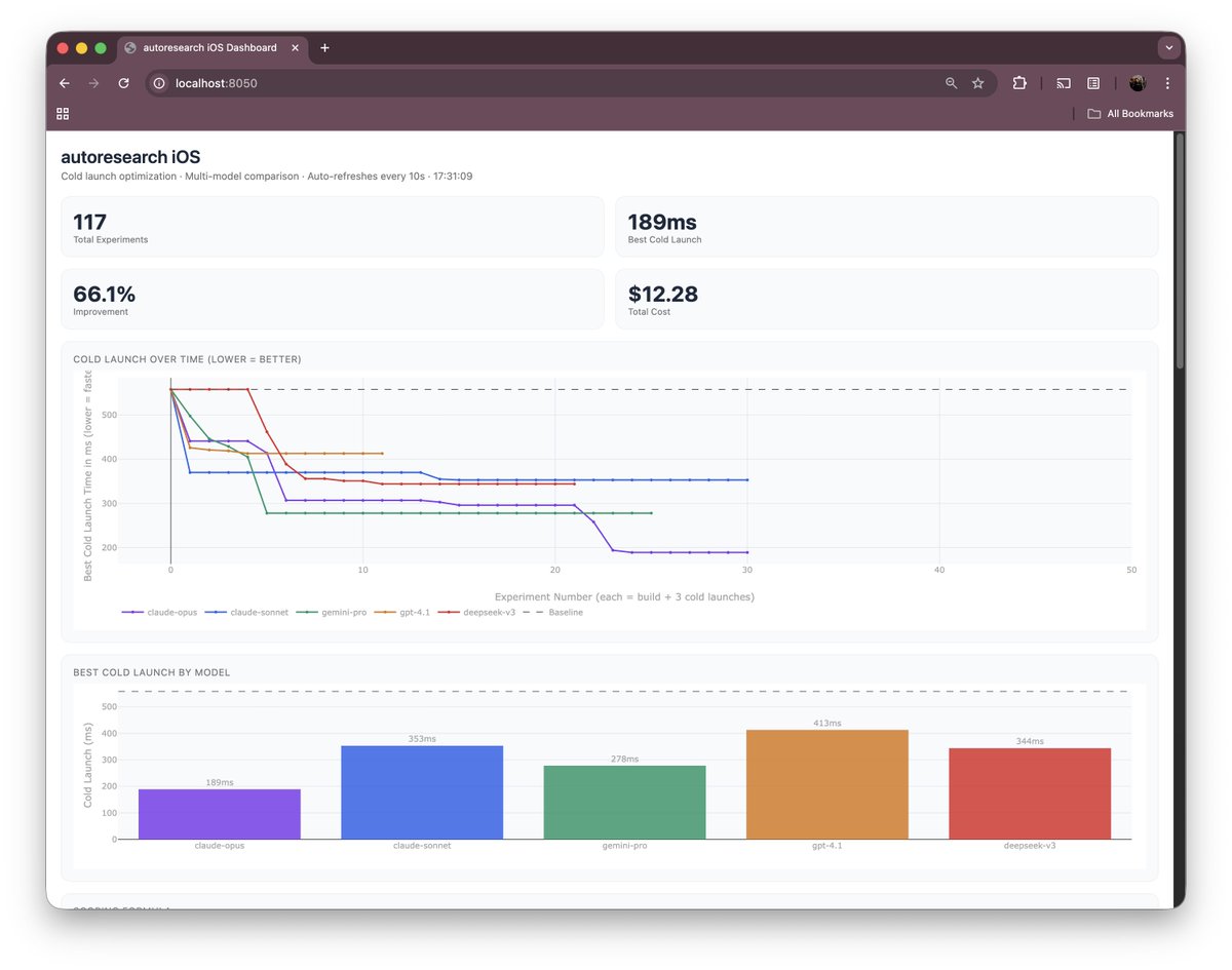 Autoresearch iOS projesinde de, beş model gerçekten beş farklı araştırmacı gibi davranmaya başladı ve her birinin optimizasyon stratejisi diğerlerinden belirgin şekilde ayrıştı diyebilirim.