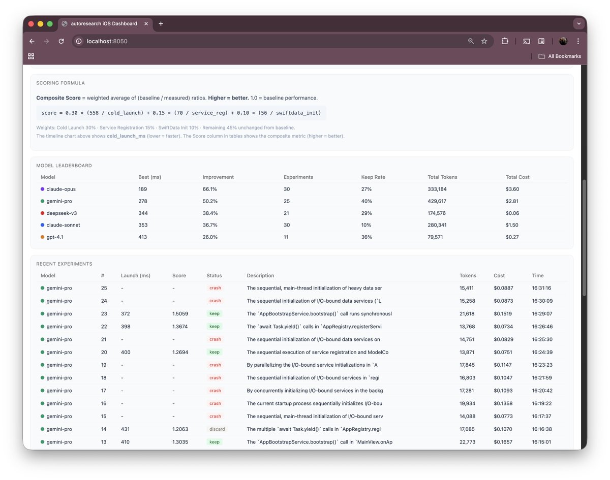 Ben de bu pattern'i görünce iOS geliştirmeye uyarlamayı denemek istedim. Middle Earth Explorer adlı App Store'da yayında olan uygulamam üzerinde 5 frontier AI modelini yaklaşık 117 deney boyunca birbirleriyle yarıştırdım. Bu fikir üzerine düşünürken en temelde, hangi model en iyi cold launch optimizasyonunu bulabilir diye merak ediyordum. Sonuç olarak uygulamanın cold launch süresini 558 milisaniyeden ~189-200 milisaniyeye indirmeyi başardım diyebilirim. Bu yüzde 66'lık bir iyileşmeye ve $12.28'lık bir toplam maliyete karşılık geldi. Ortaya çıkan süreç hem teknik hem de metodolojik açıdan oldukça öğretici oldu diye düşünüyorum.